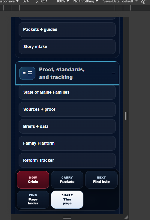 I do not want people in Maine to have to guess which page is the serious one. The strongest route is dashboard first, evidence second, initiative third, then the portable materials that let someone carry the work without flattening it.